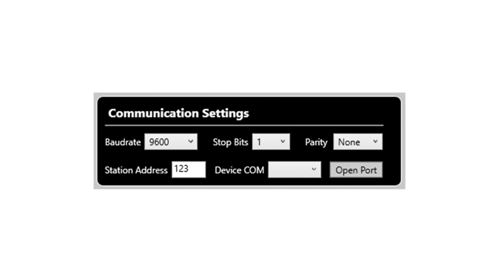 در در بخش communication setting، پارامترهای ارتباطی جهت برقراری ارتباط با دستگاه را میتوانیم تنظیم کنیم.