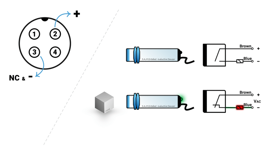 در سنسور القایی AC نرمال باز دو پین وجود دارد، پین 1 برای ولتاژ مثبت تغذیه، پین 3 برای سیگنال خروجی سنسور است که به بار متصل میشود، ولتاژ منفی سنسور نیز به سر دیگر بار وصل میشود، بقیه پین ها بدون استفاده هستند.