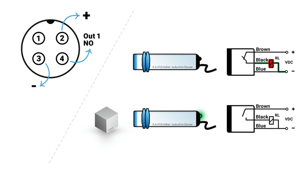 در سنسور القایی PNP نرمال باز چهار پین وجود دارد، شماتیک پین های سوکت طبق شکل زیر قابل تشخیص است
