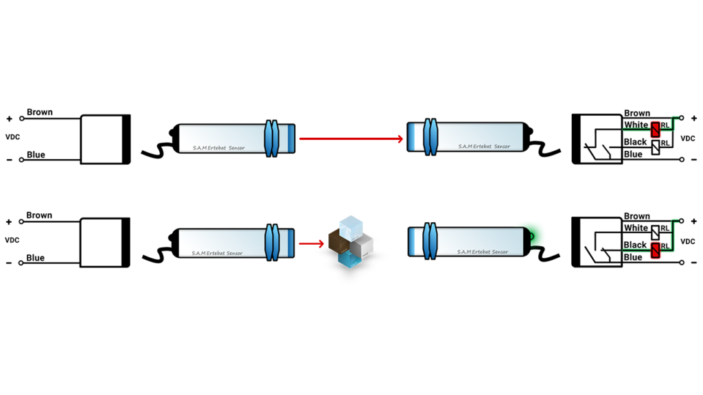 در حالتی که سنسور هیچ جسمی را تشخیص نداده، سیم سیگنال خروجی در وضعیت مدار بسته قرار دارد و سیگنال منفی در خروجی موجود است. اما به محض تشخیص جسم توسط سنسور، مدار خروجی باز شده و سیگنال منفی قطع میشود.