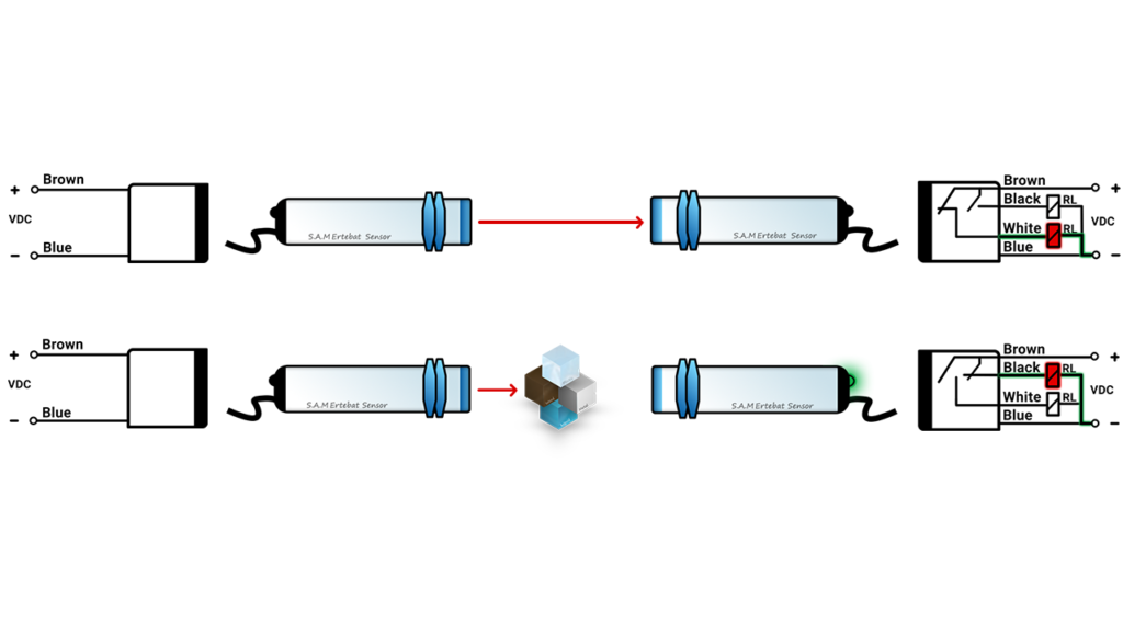 در حالتی که سنسور هیچ جسمی را تشخیص نداده، سیم سیگنال خروجی در وضعیت مدار بسته قرار دارد و سیگنال مثبت در خروجی موجود است. اما به محض تشخیص جسم توسط سنسور گیرنده، مدار خروجی باز شده و سیگنال مثبت قطع میشود.