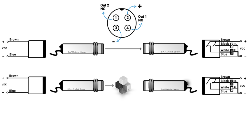 پین 1 برای ولتاژ مثبت تغذیه، پین 3 برای ولتاژ منفی تغذیه و پین 4 برای سیگنال خروجی نرمال باز NO سنسور و پین 4 برای سیگنال خروجی نرمال بسته NC سنسور می باشد.